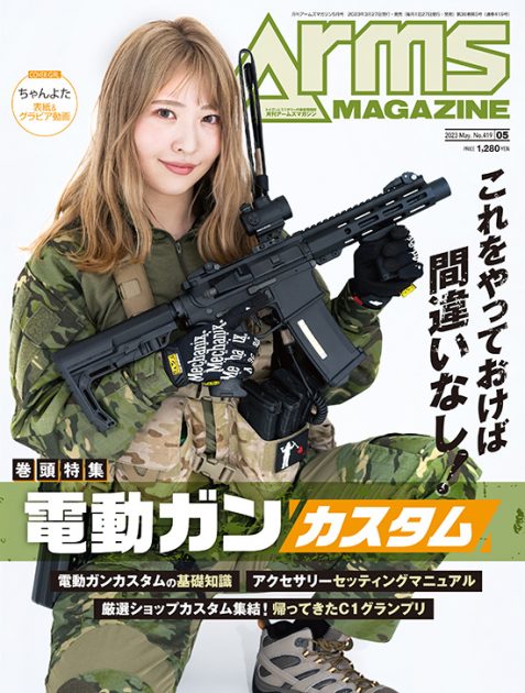 それでは、3月27日発売の2023年5月号をご紹介させていただきます。今月のカバーガールは、元警察官で現在はYouTuber、女優、プロレスラーと幅広く活躍中のちゃんよたさん。マルチカムトロピックのコンバットアパレルをベースにし、ジャングルオペレーションに従事する特殊部隊隊員をイメージしたスタイリングで表紙を彩っていただきました。徹底的に鍛え上げられた筋肉と体幹を活かしたポージングを本誌グラビアページでたくさんご覧いただくことができます。気になる方はぜひお手に取ってご覧ください。ちなみに彼女が手のしているエアガンは、今回のC1グランプリで優勝したあるショップのカスタムガンです。詳しくは誌面をご覧ください。