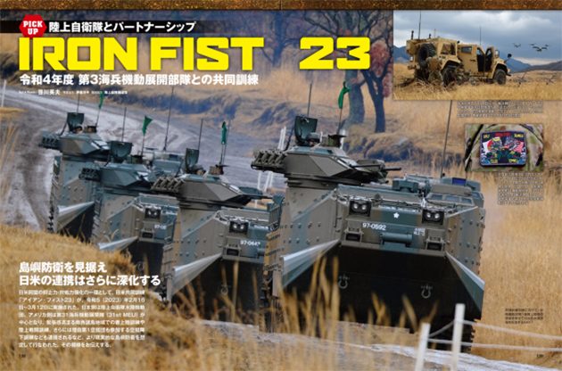 陸上自衛隊関連の記事は「アイアン・フィスト23」と「ダルマ・ガーディアン22」をピックアップ。日米共同訓練「アイアン・フィスト23」は日米同盟の抑止力・対処力強化の一環として、令和5(2023)年2月16日~3月12日に実施されました。日本側は陸上自衛隊水陸機動団、アメリカ側は第31海兵機動展開隊(31st MEU)が中心となり、南西諸島地域での着上陸訓練や陸上戦闘訓練、陸自第1空挺団も参加する空挺降下訓練など、より現実的な島嶼防衛を想定して実施されました。また、2月17日から3月2日の期間で陸上自衛隊饗庭野演習場にて実施されたインド陸軍との共同訓練「ダルマ・ガーディアン22」はB&T MP9やSIG716iなど、普段見慣れないインド陸軍の装備なども注目です。