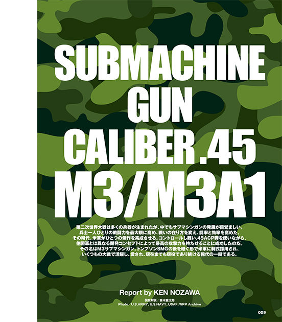 第二次世界大戦を機に多くの兵器が生まれたが、中でもサブマシンガンの発展が目覚しかった。兵士一人ひとりの戦闘力を最大限に高め、戦いの在り方を変え、能率と効率を高めたのだ。その時代、米軍がひとつの傑作を完成させる。コントロールし難い.45ACP弾を使いながら、他国軍とは異なる開発コンセプトによって最高の攻撃力を持たせることに成功した。その名はM3サブマシンガン。トンプソンSMGの後を継ぐ形で米軍に制式採用され、