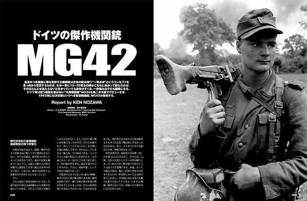 高速かつ広範囲に弾を発射する機関銃は本来の銃が持つ“一発必中”というコンセプトを真っ向から否定するものだ。だが一秒に15~20発もの弾がこちらに向かって放たれれば、そのほとんどが当たらないと分かっていても身体がすくみ、一歩踏み出すのも困難になる。ドイツ軍は使う場面を選ばない“汎用機関銃”MG34を第二次大戦でデビューさせ、1942年には決定版というべき新型機関銃、MG42が登場することとなる―――。現代にまでその影響を色濃く残す傑作機関銃MG42の誕生からその真価までを貴重な写真や図版満載でお届けする大特集!