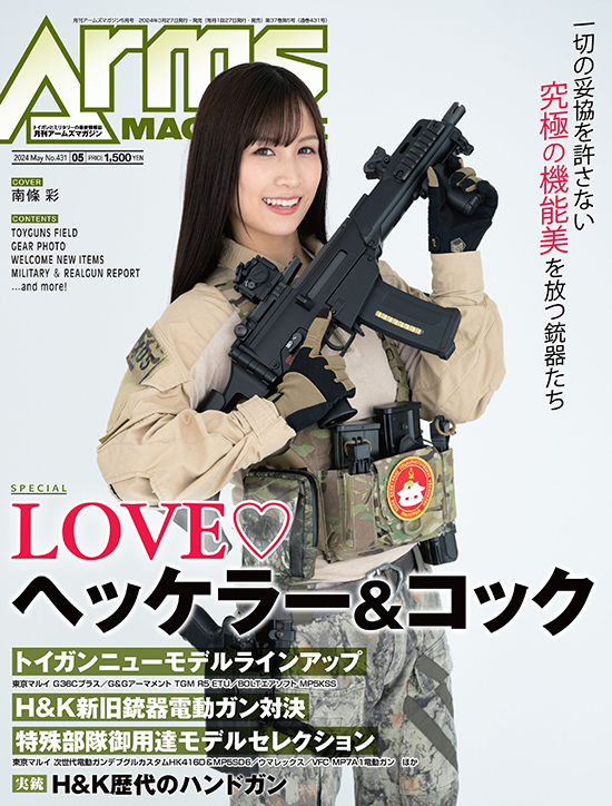 巻頭特集は「LOVEヘッケラー&コック」。現代の銃器を語るうえで欠かせないガンメーカー・ヘッケラー&コック。MP5やHK416、USPなど数多くの傑作銃を生み出し、それらのトイガンもまた人気です。そこで今月の特集では新製品から定番、カスタムモデルに至るまでヘッケラー&コックの銃器を再現したトイガンを総力チェック。リアルガンは同社の歴代ハンドガンの特徴と.45ACP弾仕様のUSP45などをレポートしています。