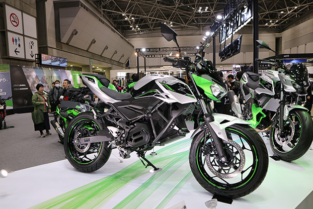 実機を見るのは今回が初めてでしたが、原付二種ということで125㏄バイクと同じくらいのスリムなボディに、カワサキらしい躍動感のあるデザインはカッコいいのですが、本来エンジンが収まっている部分に箱のようなブラシレスモーターが搭載されており一瞬違和感を感じます。バッテリーコンパートメントは燃料タンクにあたる部分にあり、リチウムイオンバッテリー(2個)は取り出して充電ができるとのことです。ミッションは電動なのでオートマチックです。走行モードが2種類から選択でき、一定の時間だけ出力向上できるブースト機能が付属しています。