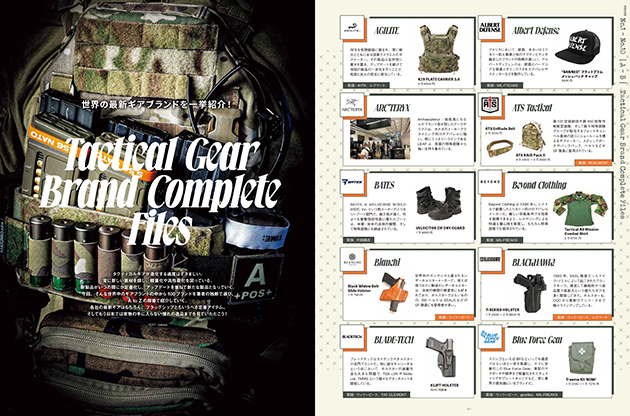 続いて装備の特集は、TACTICAL GEAR BRAND FILE です。タクティカルギアブランドをAtoZ方式で100ブランドをピックアップ。最新のギアと定番アイテムを解説します。こうしてみるといっぱいありますね。