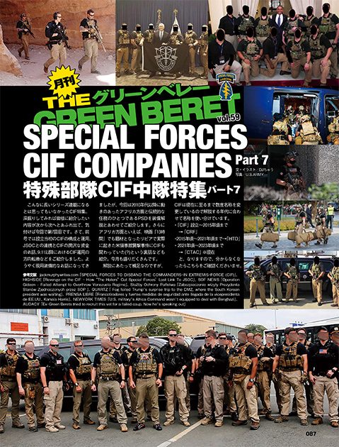 「月刊グリーンベレー」ファンの皆様、楽しいお勉強の時間です! 今月はCIF特集第7弾をお届けします。パート7となる今回は2010年代以降に動きのあったアフリカ方面と伝統的な任務のひとつであるPSDを装備解説とあわせて紹介します。さらにアフリカ方面といえば、映画『13時間』でも題材となったリビアで実際に起きた米領事館襲撃事件にCIFも関わっていた(?)という裏話なども紹介。今月も盛りだくさんです!