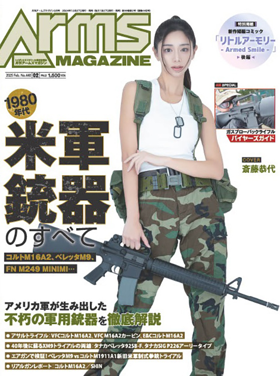 それでは、12月26日発売の2025年2月号をご紹介させていただきます。今月のカバーガールは、奇跡の9頭身ボディで話題を呼んでいる斎藤恭代さん。『ベストボディ・ジャパン日本大会』でも好成績を残しており、スレンダーボディながらも三角筋、腹筋、大殿筋などが見事にシェイプされて鍛え上げられていて、ミリタリー装備が良く似合います。今回は巻頭特集に合わせて、1980~90年代をイメージしたウッドランド装備をかっこよく&優美に着こなしてもらいました。