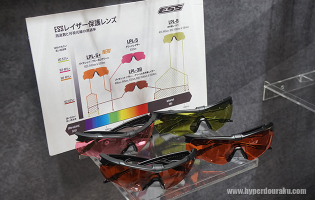 ESSの取り扱いもあるノーベルさんでは、レイザー保護レンズ仕様のアイウェアも展示。