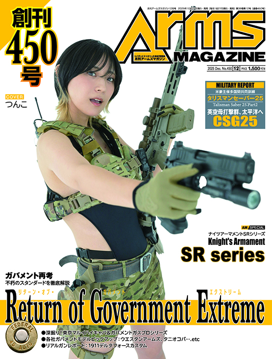 それでは、10月27日発売のアームズマガジン通巻450号記念となる2025年12月号をご紹介させていただきます。今月のカバーガールはDJ、声優、コスプレイヤー、モデルなど幅広く活躍しているつんこさん。映画、アニメから飛び出してきたようなセクシーでタクティカルなスタリングでキメてもらいました。
