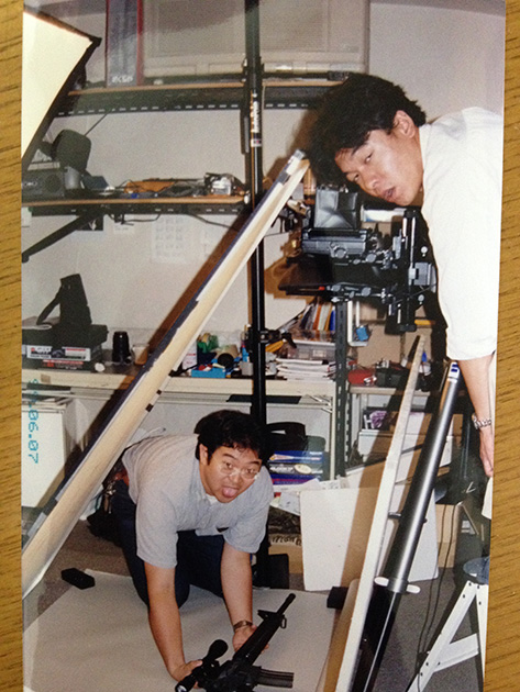 写真は1999年6月7日に撮影した紙焼き写真をスキャンしたもので、当時の撮影室で、今も撮影を担当している入社したばかりの玉カメラマンと新製品の撮影をしているところです。この時私は27歳。デジタルカメラが普及し始める前だったのでフィルムカメラで撮影しています。試行錯誤を繰り返していた時代ですが、本当に懐かしいです。