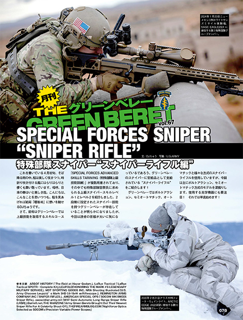 ●前号から始まったグリーンベレー的スナイパーの紹介。第2回となる今回はグリーンベレーのスナイパーに官給品として支給されているボルトアクション方式の“スナイパーライフル”を深掘りして紹介。もちろん使用する光学機器にも言及しております!